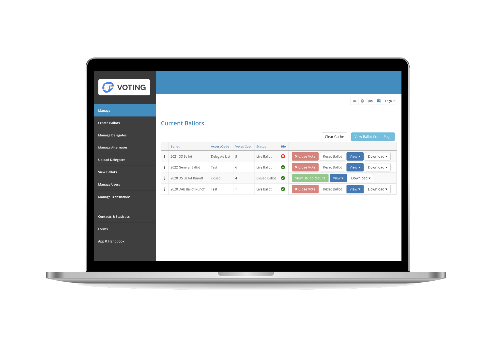 Create a custom ballot with questions, candidates, and candidate bios & pics that integrate in real-time into the app. Once your voting is done, simply close a ballot and view the results!