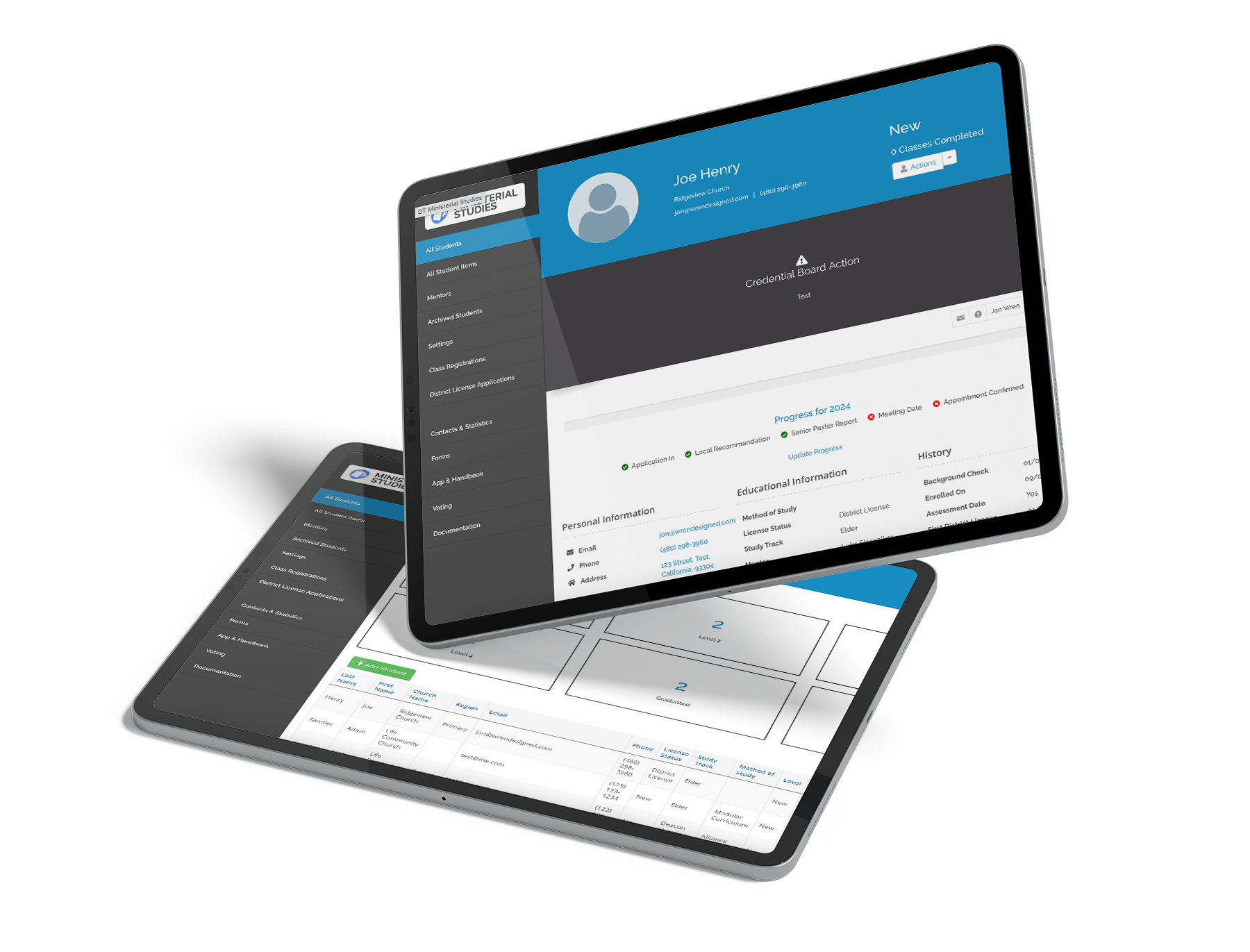 Our Ministerial Studies tracking system creates a digital folder of everything you need to track their progress from local license to retirement. You can easily see what has been submitted for the current year, add completed classes, generate reports, transfer to other Districts and more!