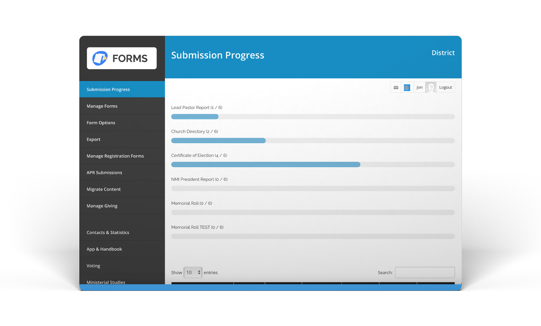 The District Toolbox helps you easily track what churches have reported, who is in progress, and what needs to be done.